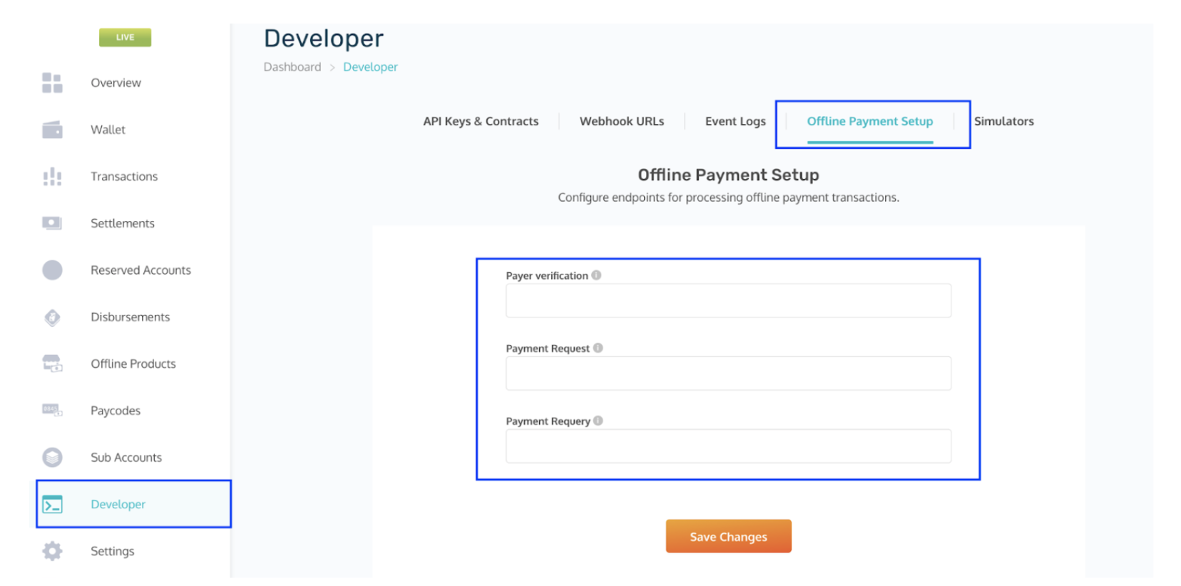 After the creation of an offline product, the merchant is required to configure some necessary endpoints in order to receive payments seamlessly from customers. These endpoints can be configured by navigating to the developer section, on the offline payment setup tab.
